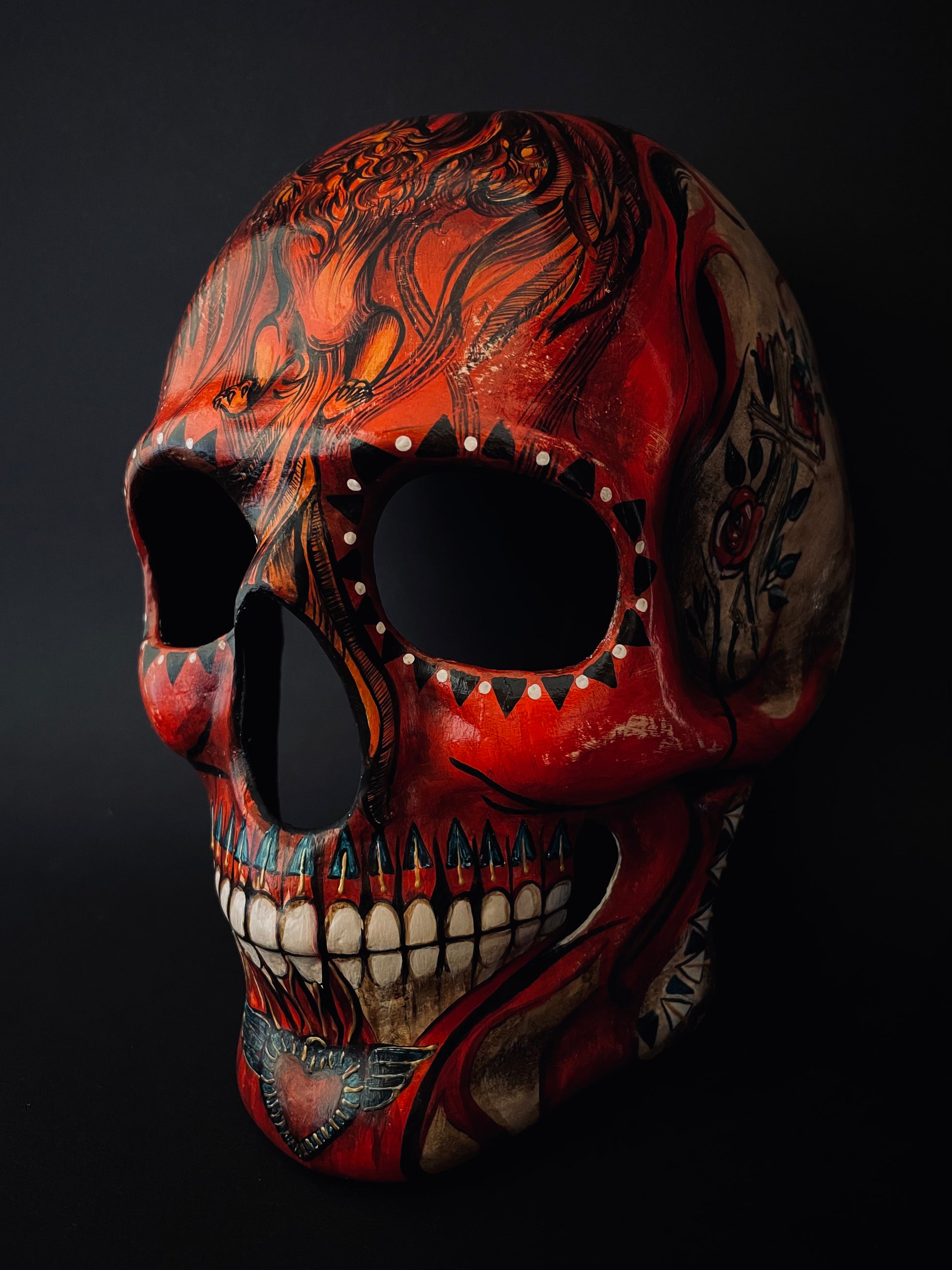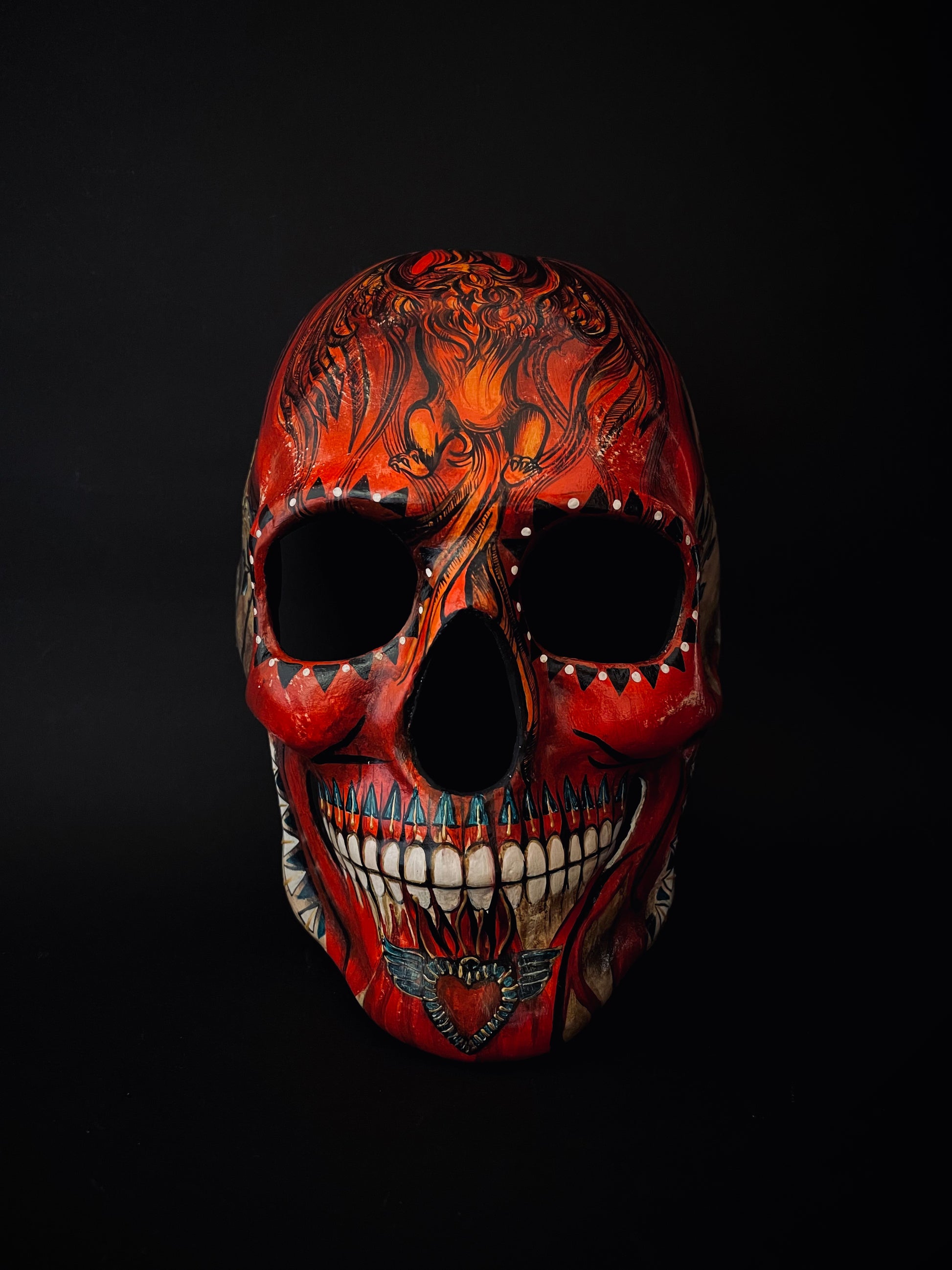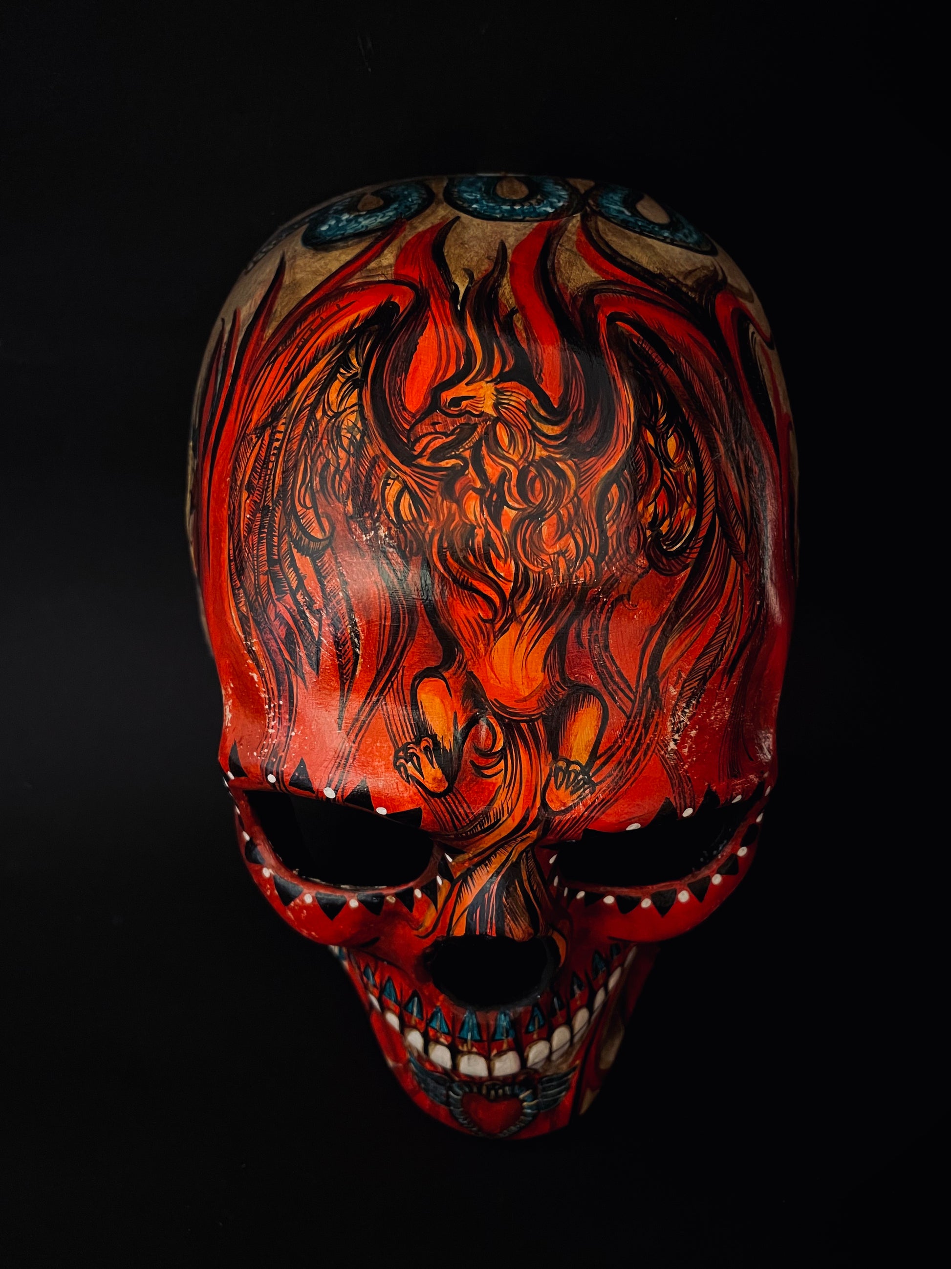 Red skull with phoenix bird. Skull mask.