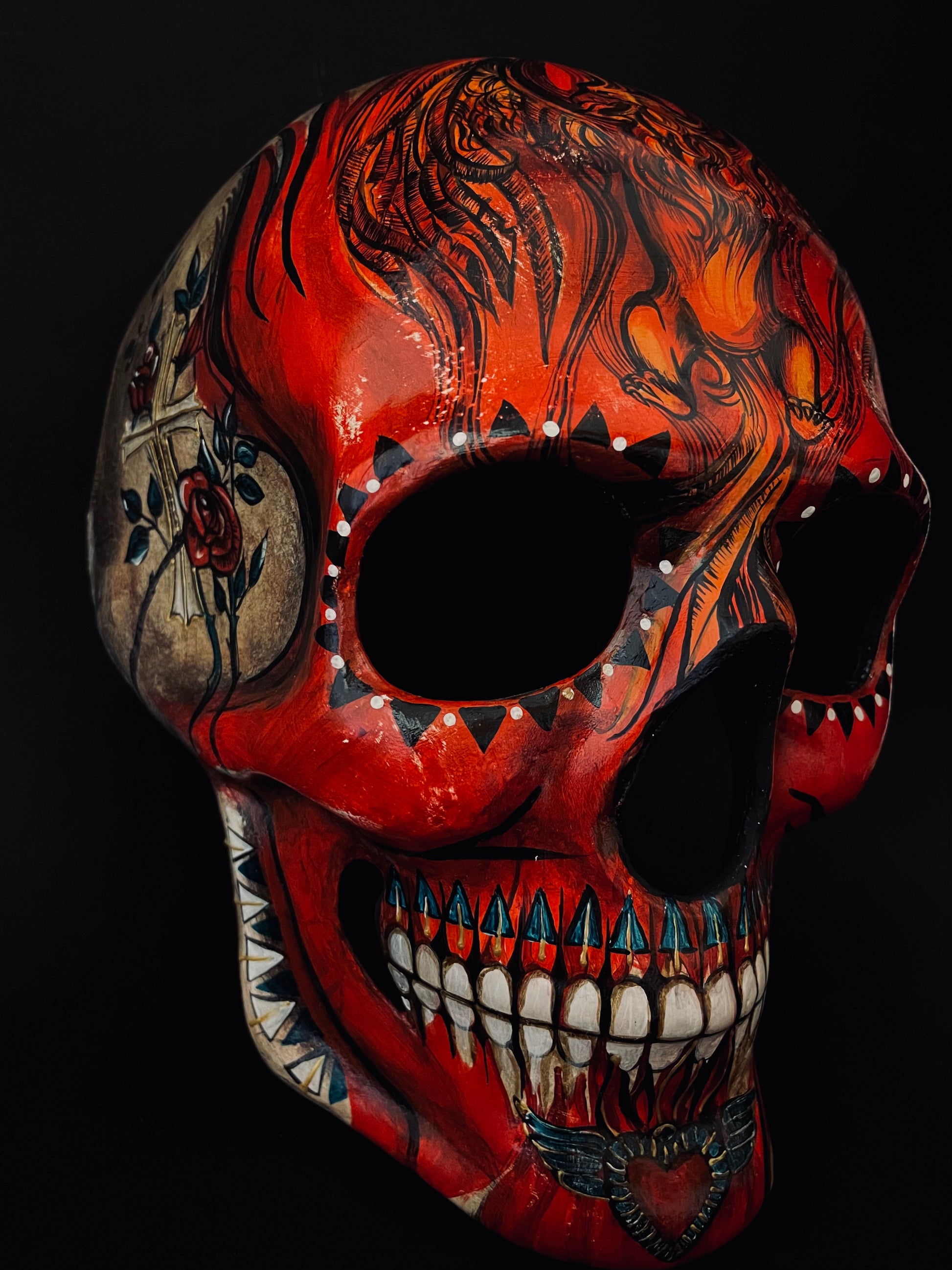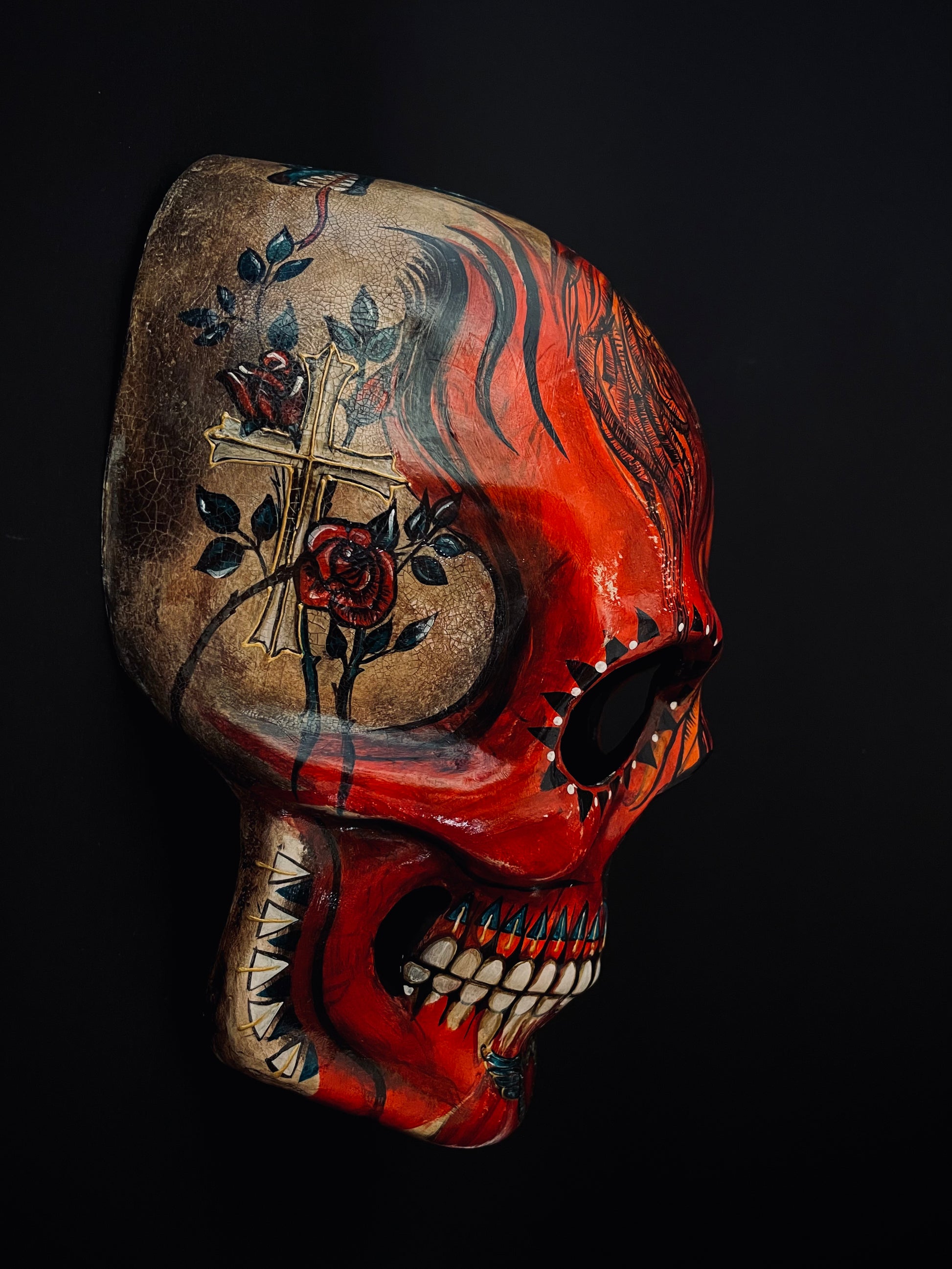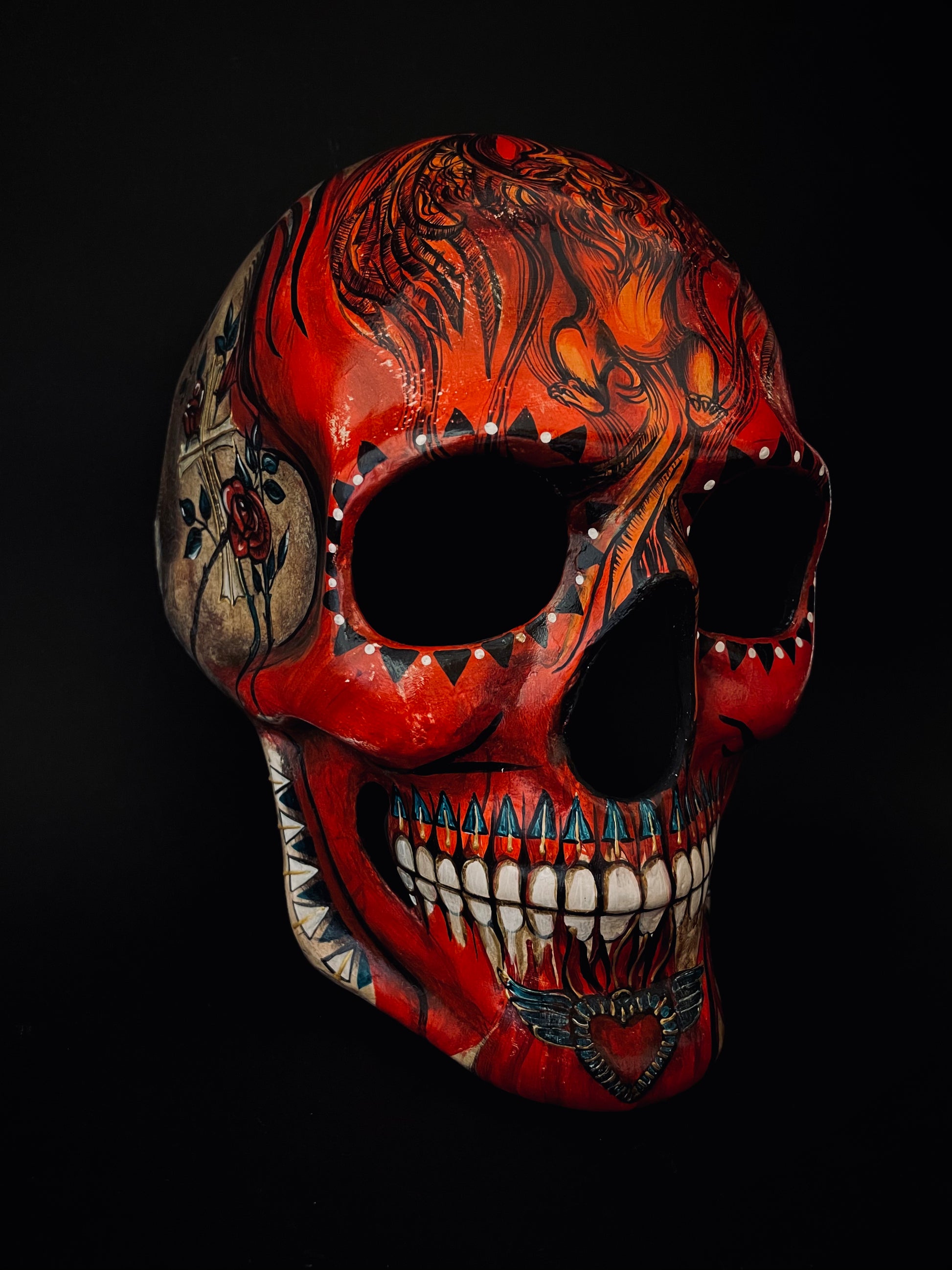 Red skull with phoenix bird. Skull mask.